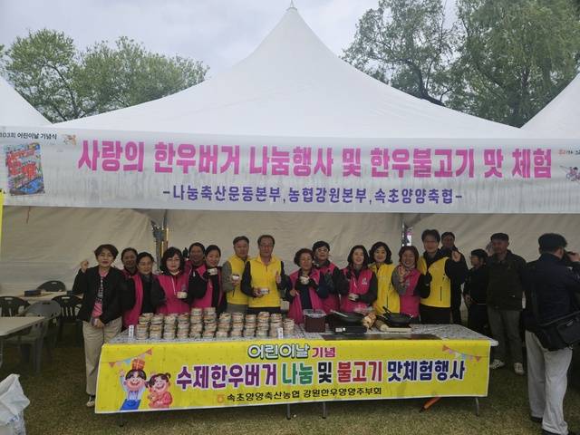 강원농협본부(본부장 김경록)와 속초양양축협(조합장 이양중)이 어린이날을 맞아 영양 가득한 한우 나눔 행사를 열었다(사진).