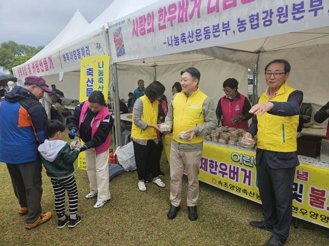 강원농협·속초양양축산농협·나눔축산운동본부 강원도지부는 3일 양양군 양양읍 송이조각공원에서 ‘나눔축산 한우버거 나눔 및 한우불고기 맛 체험’을 개최했다.