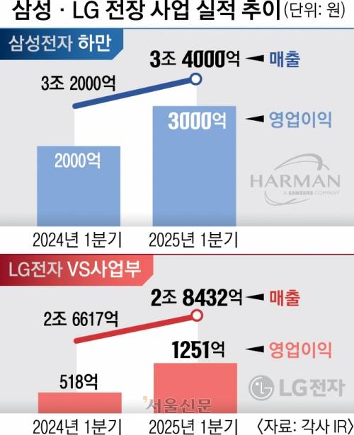 인수 첫해인 2017년 하만의 영업이익은 600억원에 불과했지만 2023년 1조 1700억원의 영업이익을 내며 ‘1조 영업익’ 시대를 열었다. 증권가에서는 하만이 올해 1조 5000억원 수준의 영업이익을 달성할 것으로 전망한다. 빠르면 올해 연간 영업이익에서 처음으로 VD·DA사업부를 제칠 가능성도 점쳐진다.