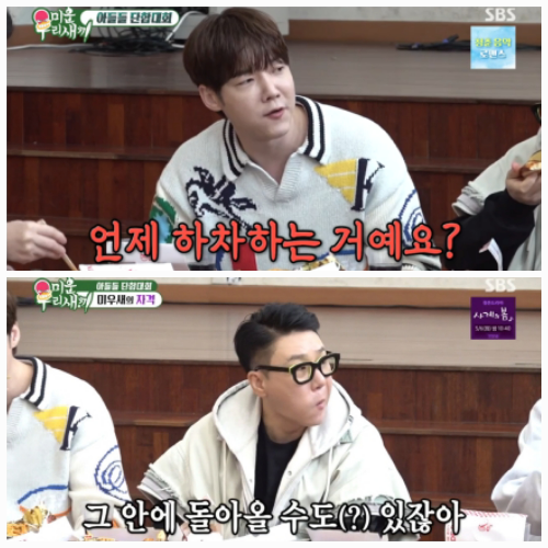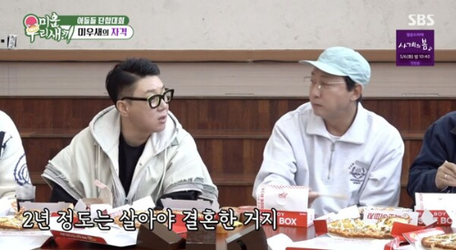 분위기가 무르익던 중 배우 최진혁이 “준호 형, 종민이 형은 언제 하차하냐”고 묻자, 아직 혼인신고 전임을 밝힌 김종민이 얼버무렸고, 이상민은 “결혼을 해도 출연하는 게 맞다”고 단호하게 말하며 본인의 상황을 암시했다. 이에 탁재훈이 의미심장하게 “너 뭐 있어?”라고 묻자, 이상민은 당황한 듯 “2년은 살아봐야지”라고 응수했다.