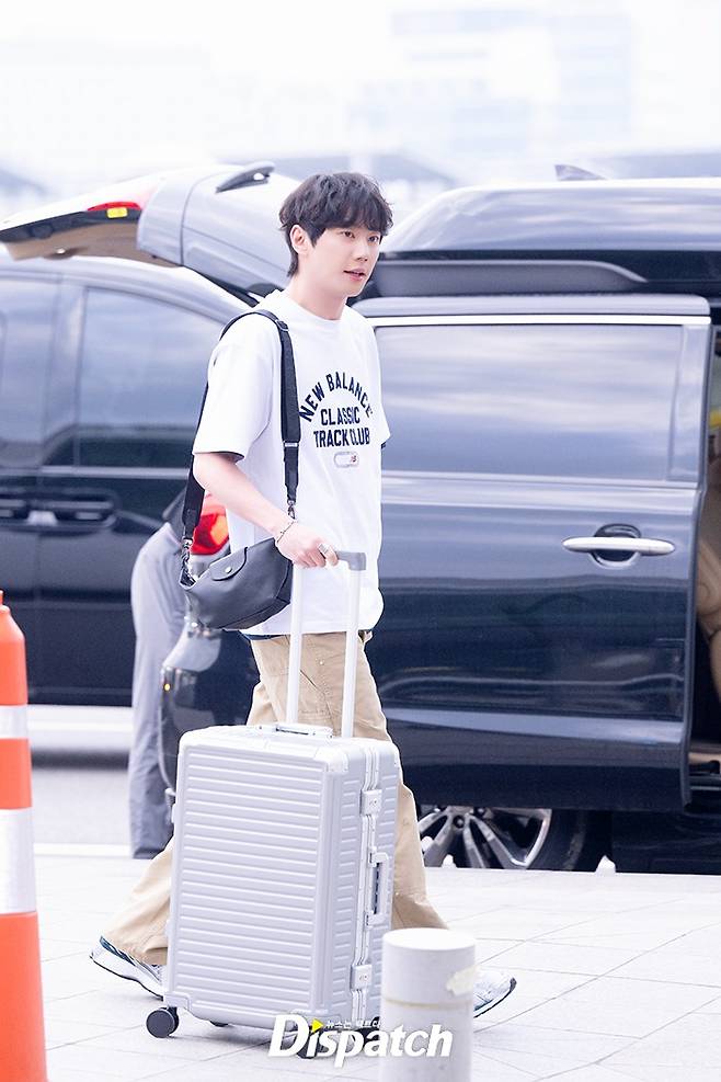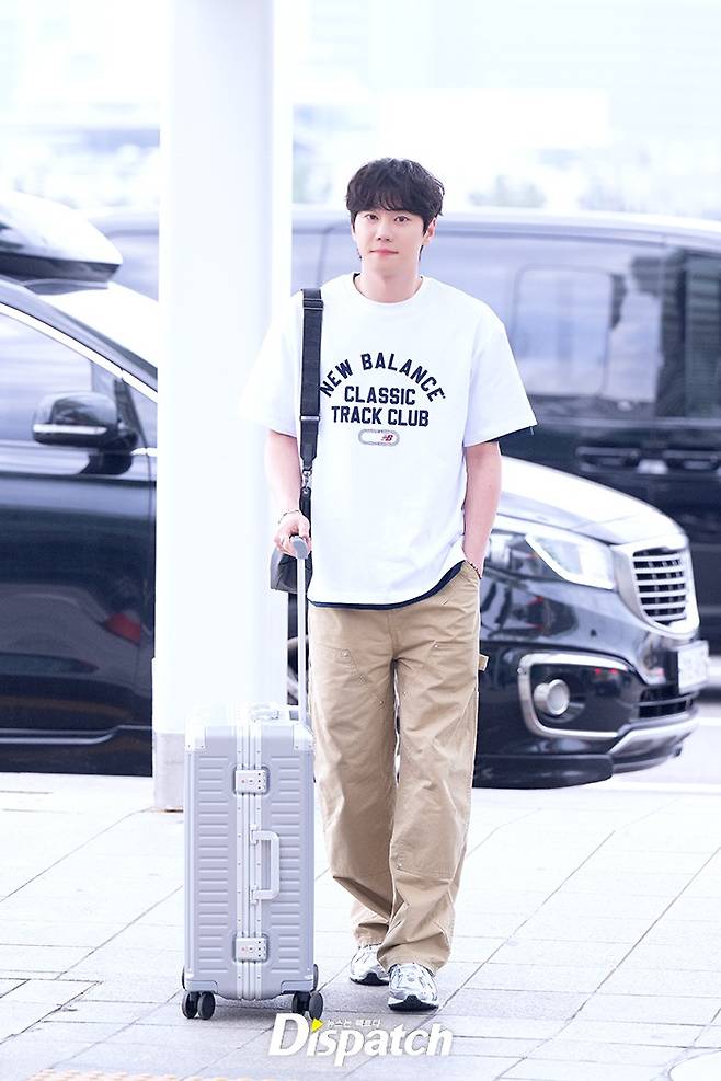 이준영은 베이지 팬츠에 화이트 티셔츠로 댄디한 공항패션을 연출했다. 우월한 비율과 훈훈한 비주얼이 돋보였다.