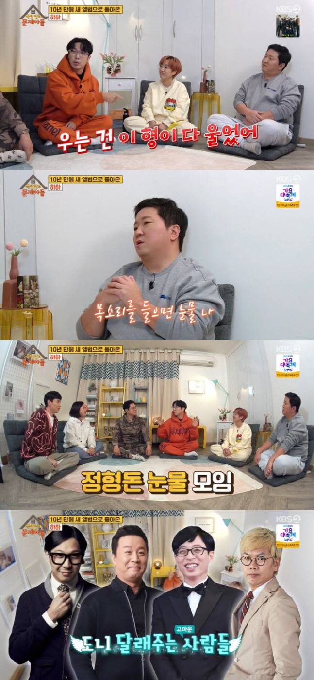 당시 하하는 "(정형돈이)술만 취했다 하면 전화를 한다. 재미있게 통화를 하다가 2초 정적 후에 '그거 기억나냐'면서 울기 시작한다"고 했다. 이에 정형돈은 "전화를 해서 목소리를 들으면 눈물이 난다. 옛날 생각도 나고, 고생 진짜 많이 했으니까"라고 밝혔다.