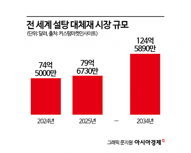 글로벌 시장에서도 이러한 흐름은 뚜렷하게 나타난다. 글로벌 시장조사기관 커스텀마켓인사이트에 따르면 전 세계 설탕 대체재 시장 규모는 올해 79억 6730만 달러(약 11조3630억원)에 이를 것으로 예상된다. 연평균 성장률은 5.28%로, 2034년에는 124억 5890만 달러(약 17조7688억원)까지 확대될 전망이다.