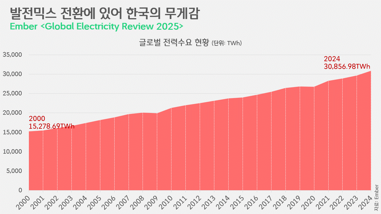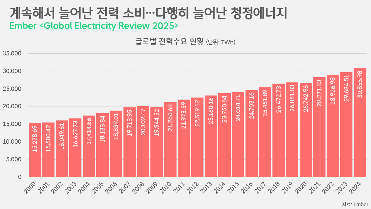 우리의 전력수요는 좀처럼 줄어들지 않고 있습니다. 글로벌 기후 에너지 싱크탱크인 엠버에 따르면, 2000년 1만 5,278.69TWh였던 글로벌 전력수요는 지난해 3만 856.98TWh로20여년새 배가 됐고, 역대 최대 기록을 4년 연속 경신했습니다.