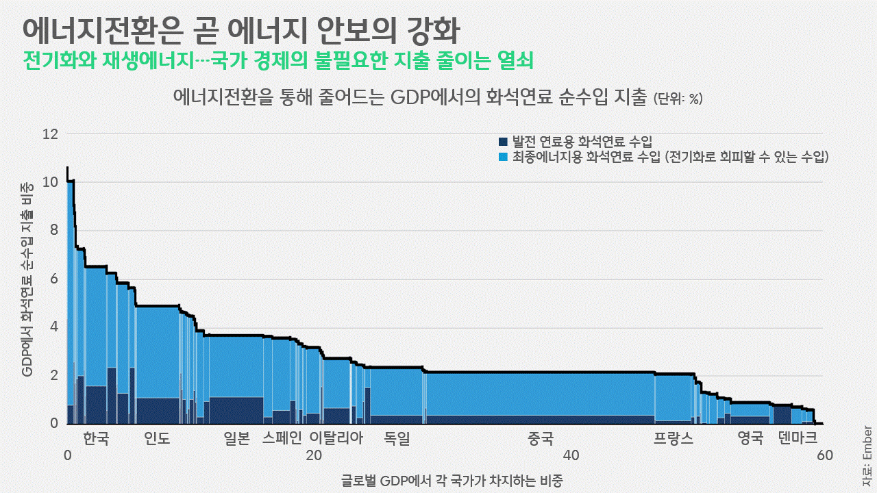 이처럼 세계 각국이 에너지전환에 나서는 이유는 '국익의 극대화'입니다. '지구를 위해서'라는 명분 뒤에 숨은 진짜 의도인 셈이죠. 엠버는 최근 〈불안정한 세계 속 에너지 안보〉라는 보고서를 발표하며 에너지전환이 GDP에 미치는 영향을 분석했습니다. 당장 전 세계 인구의 76%가 석탄 수입국, 79%가 석유 수입국, 62%가 천연가스 수입국에 속했습니다. 탈화석연료가 불안정한 국제 정세에 따라 널뛰는 가격 리스크를 없애고, 자국의 에너지 자급률을 높임으로써 에너지 안보를 확보하는 전략인 이유입니다.