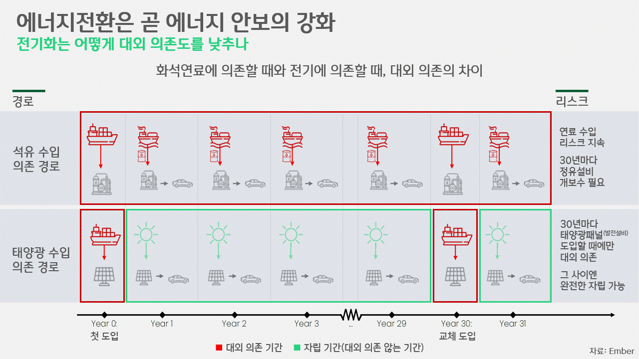 이처럼 에너지전환을 통해 달성하는 에너지 자립은 국가의 에너지 안보 확립으로 이어집니다. 엠버는 수입산 석유에 기반한 경제 시스템과 수입산 태양광 패널에 기반한 경제 시스템을 비교했습니다. 수입 석유 기반 시스템 하에선 매년 연료 수입을 하는 과정에서 대외 의존이 계속돼 수급 리스크가 지속되며, 더욱이 매 30년 정유설비의 개보수가 뒤따라야 한다고 설명했습니다. 반면, 수입 태양광 패널 기반 시스템에선 처음 발전설비를 도입할 때엔 대외 의존이 불가피하지만, 이후 설비를 운영하는 동안엔 오롯이 에너지 자립이 가능하고, 이후 30년차에 새로 설비를 교체할 때에만 일시적으로 대외 의존을 하게 된다고 이 둘을 비교했습니다. 중동 등을 중심으로 한 화석연료에 의존하는 것보다, 중국 등 특정 국가가 패권을 쥐고 있는 재생에너지 발전설비를 도입하는 것이 더 리스크가 적다는 겁니다.
