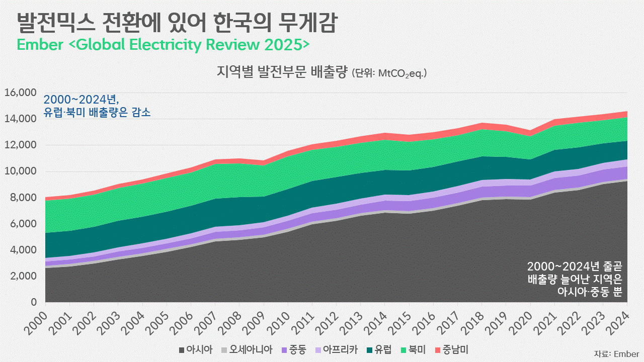 기후변화 책임의 경중을 따지는 근거가 될 온실가스 배출량은 그럼 어떻게 달라졌을까. 전력 생산에서 비롯된 전 세계 온실가스 배출은 2000년 약 8,056Mt에서 2024년 1만 4,602Mt으로 81.3% 증가했습니다. 그런데, 이 기간 주요 배출 지역 가운데 배출량이 크게 늘어난 것은 아시아와 중동 뿐입니다. 아시아에서의 발전부문 배출은 2000년 2,624Mt에서 2024년 9,263Mt으로 무려 3.5배가 됐습니다. 중동 또한 같은 기간 331Mt에서 949Mt으로 2.9배가 됐고요. 그 외에도 상대적으로 적은 양이나 아프리카(2000년 274Mt → 2024년 528Mt)와 중남미(2000년 274Mt → 2024년 469Mt)의 배출도 늘었습니다. 반면, 유럽의 배출은 1,909Mt에서1,435Mt으로 24.8% 줄었고, 북미는 2,458Mt에서1,792Mt으로 27.1% 감축했습니다. 글로벌 통계에서 그 비중이 그리 크지 않은 오세아니아 또한 2000년 186Mt에서 2024년 166Mt으로 감축을 이뤘고요.