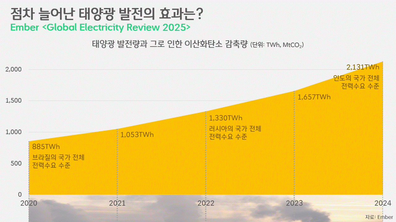 엠버는 2020년 글로벌 태양광 발전 총량인 885TWh는 당시 브라질의 국가 전체 전력수요에 해당할 정도라며, 이를 무탄소 발전원으로 생산함으로써 줄여낸 온실가스의 양은 662Mt, ASEAN 지역 전체의 전력부문 배출량에 맞먹는다고 설명했습니다. 2022년엔 전 세계 태양광 발전량이 1,330TWh로, 러시아의 연간 전력수요와 같고, 그로 인한 감축량은 1,034Mt으로 중동 지역 전체에서 전력 생산 과정에 뿜어낸 온실가스의 양과 같았습니다. 그리고 2024년, 인도의 연간 전력수요에 해당하는 2,131TWh의 전력이 세계 곳곳의 햇빛으로 만들어졌고, 그 덕에 미국의 전력부문 연간 배출량인 1,658Mt의 온실가스를 감축할 수 있었습니다.