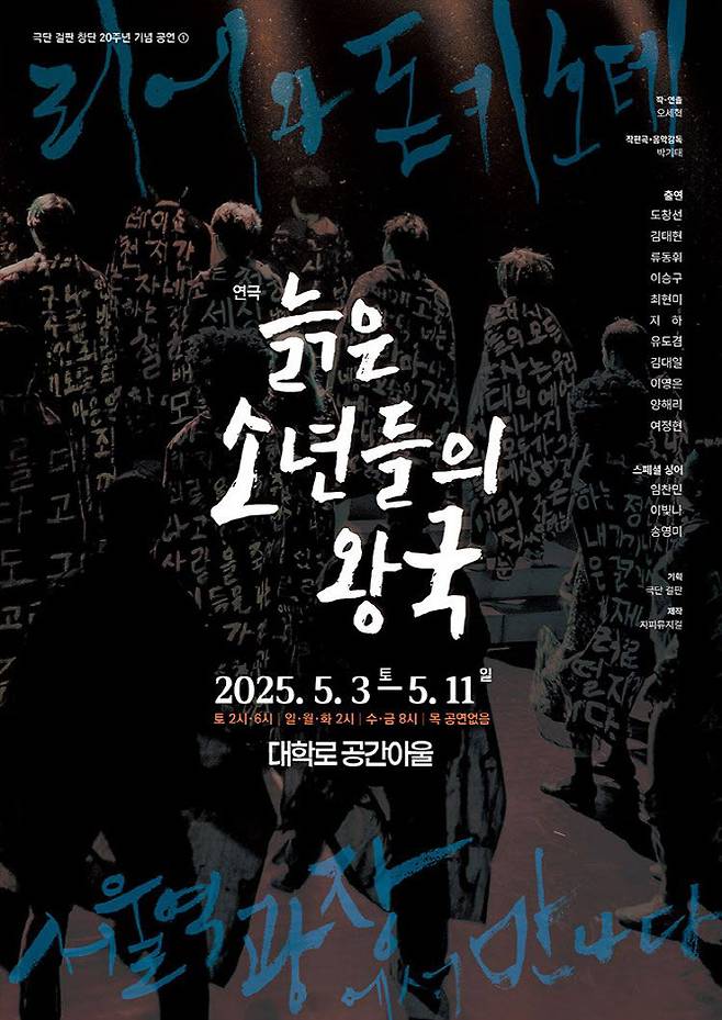 딸자식들에게 버림받고 광야를 헤매고 있는 비극의 왕 리어. 비바람에 흔들리며 울고 있는 그를 보고 마구 웃어대는 희극의 왕 돈키호테. 이들은 서로 ‘잃어버린 반쪽’일지 모른다며 함께 모험을 시작한다. 이미 부랑자들이 터를 잡은 서울역 광장에서 말이다. 2014년 대학로 초연부터 2017년 일본 소극장 투어까지 국내외 관객과 만나 온 작품으로 극단 걸판 창단 20주년을 맞아 다시 무대에 오른다. 오세혁 극작·연출로 배우 도창선, 김태현, 류동휘, 이승구, 최현미, 지하, 유도겸, 김대일, 이영은, 양해리, 여정현, 임찬민, 이빛나, 송영미 등이 출연한다.