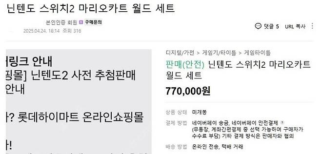 그럼에도 불구하고 한국에서는 정식 출시도 전에 웃돈이 붙었다. 사전 예약 당첨자들이 자신의 구매권을 중고 거래 사이트에서 되팔고 있다. 중고나라, 번개장터 등 중고 거래 사이트에는 '닌텐도 스위치 2'와 '마리오카트 월드' 세트를 정가보다 비싸게 판매한다는 글이 올라왔고, 실제로 판매된 사례도 확인되고 있다.