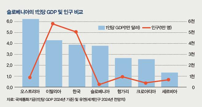 슬로베니아의 인구는 대구광역시보다 조금 적은 212만 명이다. 면적은 경상북도보다 약간 넓다. 알프스산맥 끝자락의 자연 말고는 내세울 만한 자원도 없고 내수시장도 작은 편이다. 하지만 국제통화기금(IMF)이 발표한 1인당 국내총생산(GDP)은 약 3만6천달러(약 5200만원, 2024년 기준)로 우리나라(3만7천달러)와 거의 비슷하다. 오스트리아를 제외하고는 중부 및 남동부 유럽에서 독보적인 1위다.