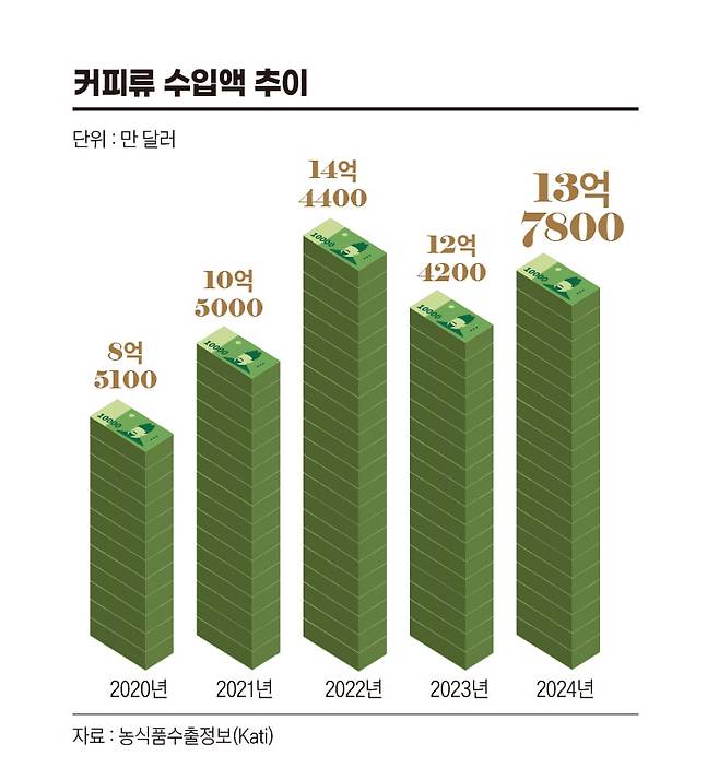 수년 전과 비교하면 그동안 한국인들의 커피 사랑이 얼마나 커졌는지를 엿볼 수 있다. 2020년만 해도 커피 수입액은 8억5000만 달러였다. 4년 동안 무려 5억 달러 넘게 금액이 늘어난 것이다. 한국농수산식품유통공사(aT) 관계자는 “매년 커피 시장이 포화했다는 우려가 제기되고 있음에도 불구하고 수치를 보면 여전히 시장은 계속 커지고 있다”고 분석했다.