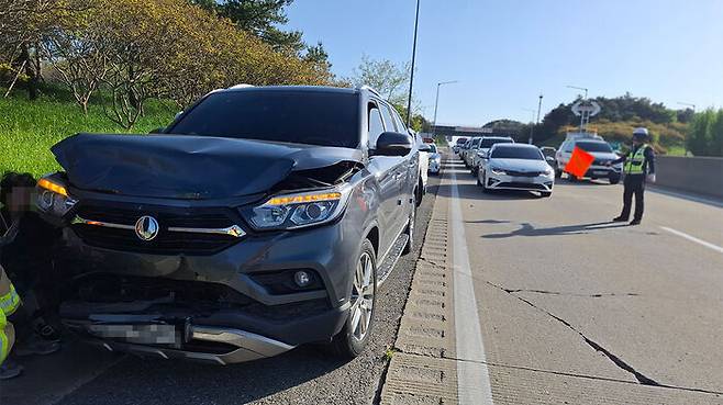 ▲ 전남 함평군 학교면 무안-광주고속도로 상행선 동함평나들목(IC) 인근에서 지난 4일 오후 4시 52분께 차량 3대가 부딪히는 이중 추돌사고가 발생해 현장 수습이 이뤄지고 있다.