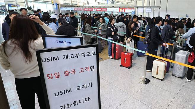 ▲ 5월 1일부터 엿새간 이어지는 황금연휴를 앞둔 지난달 30일 인천국제공항 제1여객터미널 SK텔레콤 로밍센터에서 출국자들이 유심 교체를 위해 대기하고 있다.
