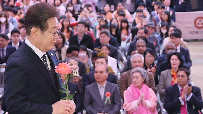 ▲ 더불어민주당 이재명 대선 후보가 5일 서울 종로구 조계사에서 열린 불기 2569년 부처님오신날 봉축법요식에서 육법공양 중 헌화를 위해 이동하고 있다.