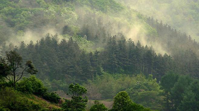 ▲ 송홧가루 내뿜는 소나무들