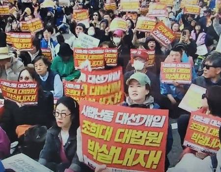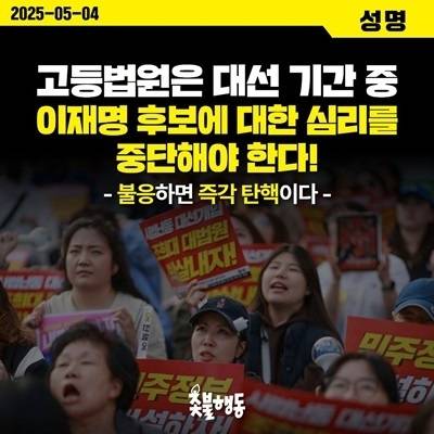 이어 "법관들이 내란수괴의 대리인이 아니라 법과 민주주의의 수호자들이어야 한다"며 "그러나 조희대는 이미 명백하게 무죄판결이 난 재판을 유례가 없는 속도로 전원합의체 회부하였고, 비상식적인 논리로 파기환송을 강행했다. 이는 헌정질서를 위협하는 불법이며 사법쿠데타이다. 대선을 한달을 앞두고 이런 무리수를 두는 게 대선개입"이라고 강조했다.