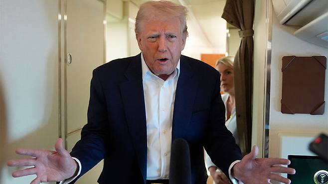 ▲ 전용기에서 취재진과 문답 나누는 트럼프 미국 대통령