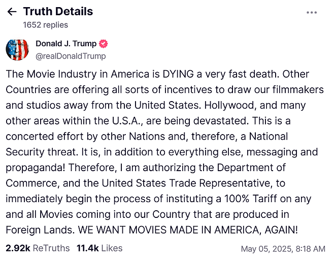 트럼프 대통령은 상무부와 미국 무역대표부(USTR)을 향해 "외국에서 제작돼 수입되는 모든 영화에 대해, 100% 관세를 부과하는 절차를 즉시 시작할 것을 승인한다"고 발표했다.
