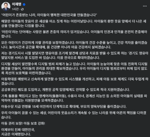 이재명 더불어민주당 대선 후보가 어린이날을 맞아 영유아 발달지원 전국확대 및 공공후견인 제도 도입을 공약했다.
