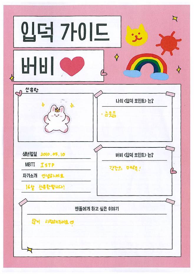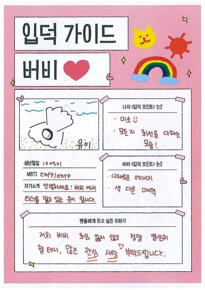 스스로의 '입덕 포인트'로 '미소'와 '무엇이든지 최선을 다하는 모습'이라고 적었는데요. 실제로도 무대 위에서 늘 밝은 에너지로 시선을 사로잡고, 현장에서도 묵묵히 최선을 다하는 모습이 멤버들은 물론 주변 사람들의 신뢰를 더하고 있죠. 작은 체구에서 뿜어져 나오는 열정, 바로 유이의 가장 큰 매력입니다.