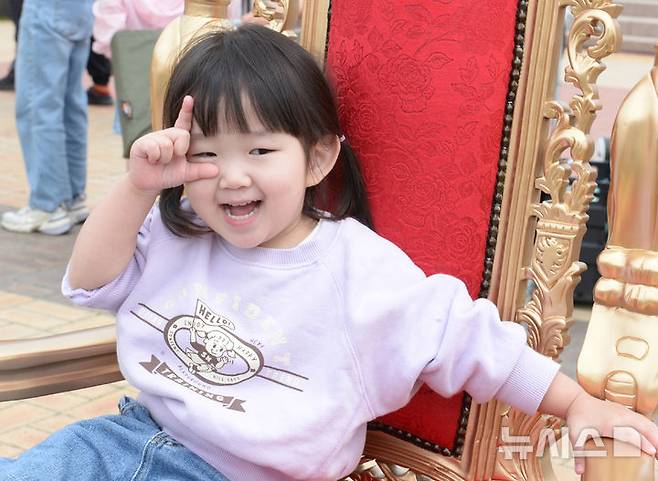 [울산=뉴시스] 배병수 기자 = 5일 오전 울산 남구 어린이대공원에서 제103회 어린이날 큰잔치 행사에서 어린이들이 왕의자리에 앉아 기념촬영을 하고 있다. 2025.05.05.bbs@newsis.com.