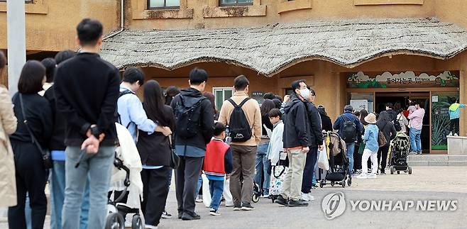 (서울=연합뉴스) 신현우 기자 = 어린이날인 5일 서울 광진구 어린이대공원 열대동물관을 찾은 시민들이 입장하기 위해 줄을 서고 있다. 2025.5.5