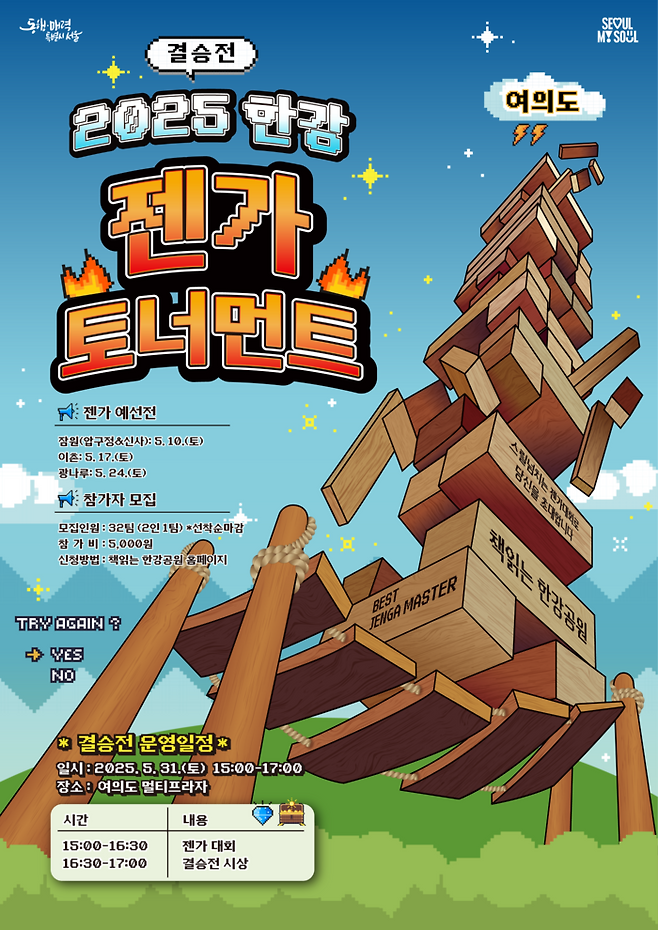 10일에는 잠원 한강공원 다목적운동장에서 32팀(2인 1팀)이 참가하는 예선이 진행해 ‘젠가 고수’ 5개팀을 선정한다. 17일과 24일에는 이촌한강공원과 광나루한강공원에서 젠가 토너먼트가 열린다. 잠원, 이촌, 광나루에서 생존한 15개 팀은 지난 해 광나루 대회에서 1위를 차지한 1개 팀과 함께 31일 여의도에서 16강전을 시작해 최후의 우승팀을 가린다.