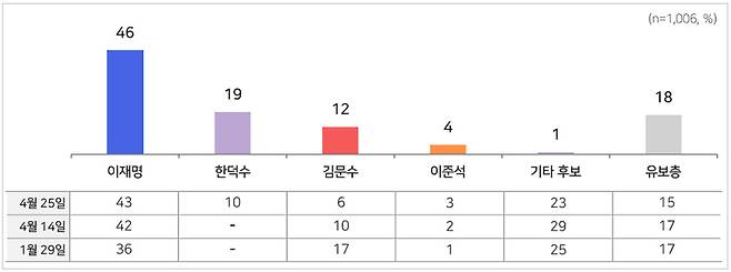 대선주자들을 모두 제시한 뒤 누가 가장 낫다고 생각하느냐는 질문에는 응답자의 46%가 이재명 후보라고 답했고, 한덕수 19%, 김문수 12%, 이준석 4%였습니다.