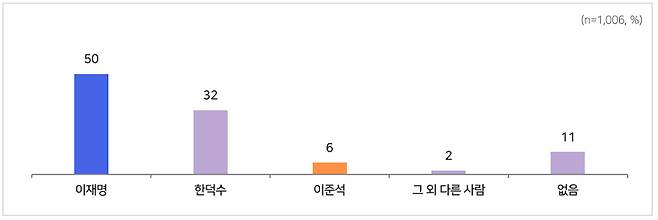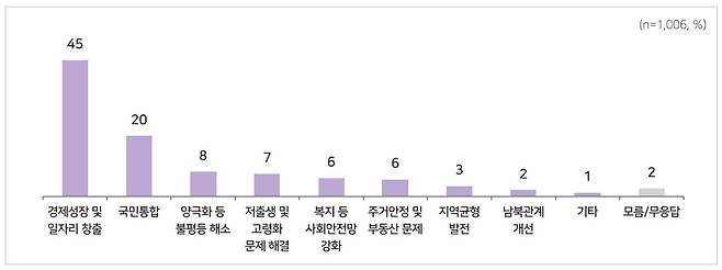 한편 응답자들은 이번 대선에서 후보들이 가장 신경을 써야하는 정책 분야로는 45%가 '경제성장 및 일자리 창출'을 꼽았고, '국민통합' 20%,'양극화 등 불평등 해소' 8%, '저출생 및 고령화 문제 해결' 7% 순이었습니다.