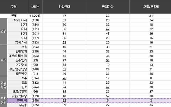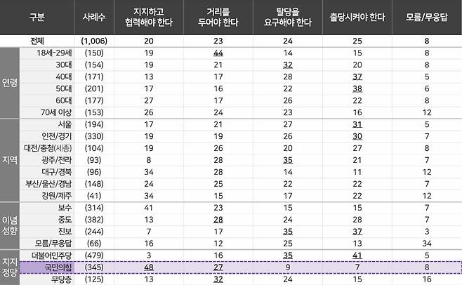 반면, 국민의힘 지지층에서는 윤 전 대통령과 '지지하고 협력해야 한다'는 응답이 48%로 과반에 가깝게 나타나, 역시 전체 응답자의 응답과는 차이가 컸습니다.