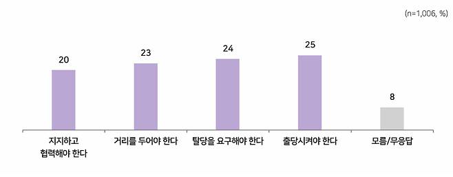 한편, 대선을 앞두고 국민의힘이 윤석열 전 대통령과 어떤 관계를 가져가야 하는지 묻는 질문에는 '출당시켜야 한다' 25%, '탈당을 요구해야 한다' 24%, '거리를 두어야 한다' 23%, '지지하고 협력 해야 한다' 20%로, 멀리 해야 한다는 의견이 훨씬 높았습니다.