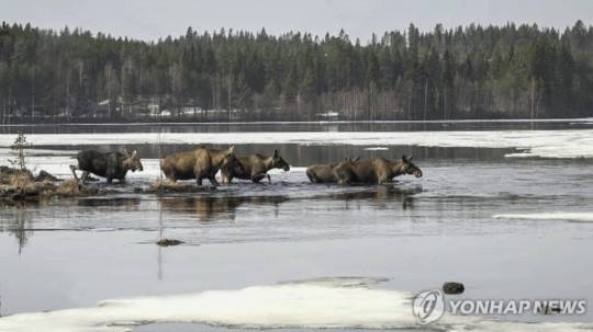 유럽에선 '엘크' 또는 북미에선 '무스'로 불리는 말코손바닥사슴 70여 마리가 스톡홀름에서 북쪽으로 약 290㎞ 떨어진 곳의 옹게르만 강을 건너 초지로 천천히 이동하는 모습이 담겼다.