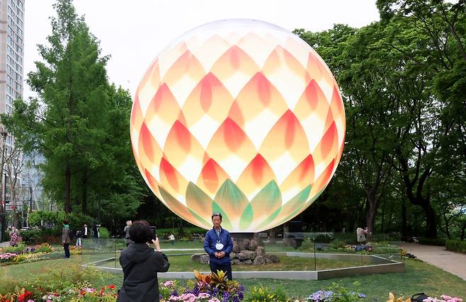 5일 서울 송파구 석촌호수 사거리에 부처님오신날을 맞아 ''더 스피어''(The Sphere)를 활용한 특별 콘텐츠를 선보이고 있다.