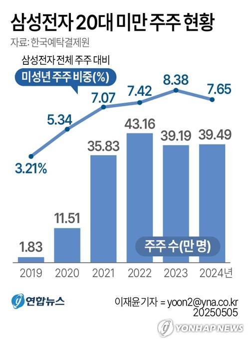 (서울=연합뉴스) 이재윤 기자 = 5일 한국예탁결제원 증권정보포털 세이브로에 따르면 지난해 말 기준 '국민주' 삼성전자 주식을 보유한 20대 미만 미성년 주주가 약 40만명 수준으로 집계됐다.