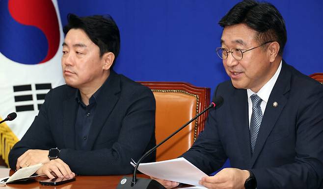 ▲ 5일 서울 여의도 국회에서 더불어민주당 윤호중 총괄선대본부장이 기자간담회를 하고 있다.