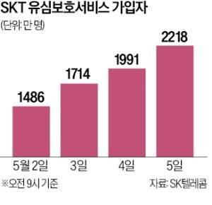 SK텔레콤은 14일까지 모든 국내외 SK텔레콤 가입자가 유심보호서비스에 가입할 것으로 전망했다. 5일 오전 9시 기준 2218만 명이 유심보호서비스 가입을 완료했다. 유심보호서비스 가입 대상은 SK텔레콤 가입자 2300만 명, SK텔레콤 회선을 쓰는 알뜰폰 가입자 200만 명 등 약 2500만 명이다.