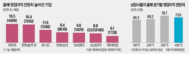 관세를 둘러싼 미·중 갈등이 완화될 것이란 기대가 나오면서 투자자들의 시선이 상장사 실적으로 향하고 있다. 특히 영업이익 컨센서스(증권사 전망치 평균)가 뛰고 있는 기업을 주목하라는 조언이 나온다. 이마트와 한화솔루션, 유니드, 에이피알 등이 대표적이다.