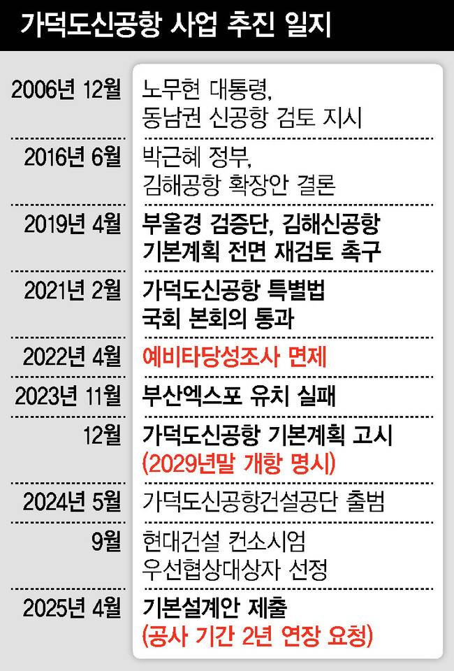 정부가 공언한 부산 가덕도신공항의 2029년 12월 개항에 적신호가 켜졌다. 신공항 건설 우선협상대상자인 현대건설 컨소시엄이 최근 공사 기간을 늘려야 한다고 국토교통부에 제안하면서 논란이 촉발됐다. 국토부는 ‘납득할 수 없다’며 대책 마련에 나섰고, 건설사들은 안전한 해상 공항을 짓기 위한 적정 공사기간이 필요하다면서 맞서는 모양새다.