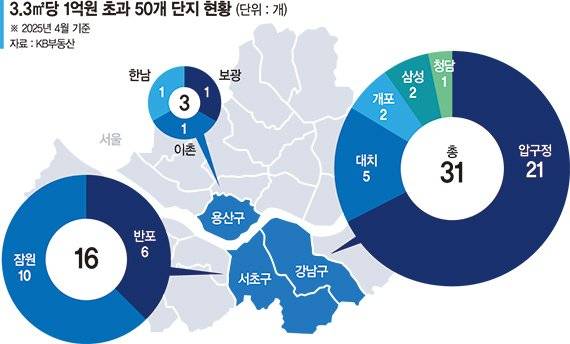 50개 단지를 보면 특정 지역에 집중돼 있다. 강남구 31곳, 서초구 16곳 등 47곳이 그 주인공이다. 강남·서초구의 고가 단지는 3.3㎡당 1억원 초과가 기본시세가 되고 있다는 지적이 나온다. 나머지 3개 단지는 강북 부촌 가운데 하나인 용산구에서 나왔다. 이촌동 한강맨션, 한남동 한남더힐, 보광동 신동아 등이 3.3㎡당 1억원 초과 단지에 이름을 올렸다.