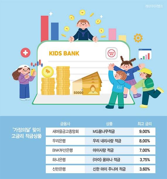 새마을금고중앙회는 어린이날을 맞아 연 9% 수준의 고금리 적금을 선보였다. 'MG꿈나무적금'은 2013년 이후 출생한 어린이(2025년생 제외)를 대상으로 월 최소 5만원에서 최대 20만원까지 납입할 수 있다. 1년 만기 상품으로 금리는 금고별 기본금리(약 2~3%)에 최대 6%p의 우대금리를 더해 적용된다. 8~9% 안팎의 금리를 제공받을 수 있는 셈이다.