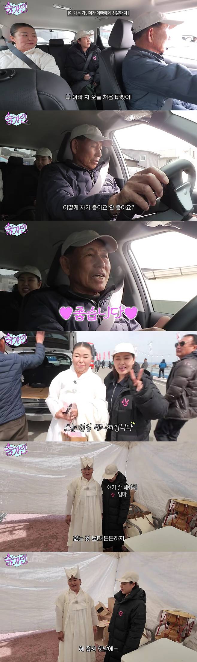 에 송가인의 아버지는 "좋다. 이 차는 '여기서 카메라 찍으니 조심해라'고 말도 잘 해준다"며 만족감을 드러냈다.