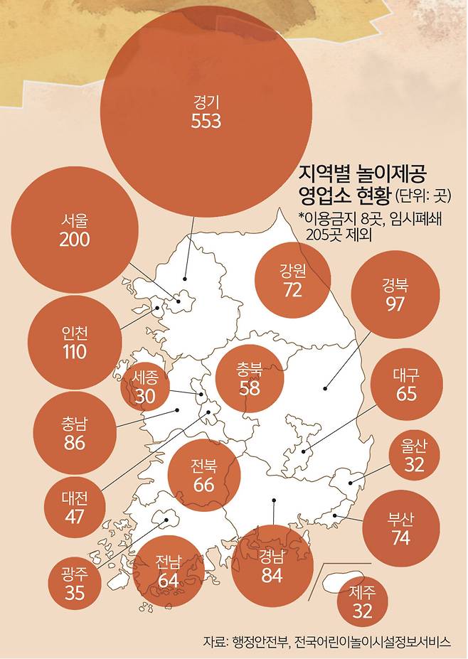 김씨의 사례는 결코 드문 이야기가 아니다. 이러한 ‘무(無)놀이터 동네’는 전국 법정동 10곳 중 8곳꼴로 존재했다. 어린이날을 맞은 5일 행정안전부의 ‘전국어린이놀이시설정보서비스’에 이달 2일까지 등록된 놀이시설 8만9030곳을 전수 분석했다. 그 결과 전국 2만275개 법정동 가운데 1만6206곳(79.9%)에 어린이놀이시설이 한 개도 없었다. 또 이러한 무놀이터 동네는 지방 소도시에 몰려 있었다. 어린이가 마음껏 뛰어놀 수 있는 공간인 놀이터조차 지역에 따라 불평등한 모습이었다.
