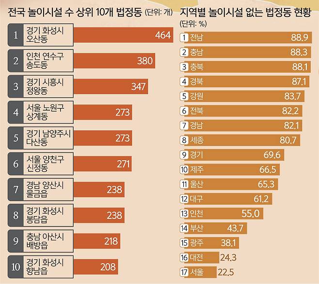 무놀이터 동네 비율이 가장 높은 곳은 전남이었다. 전남 전체 2974개 법정동 가운데 2645곳에 놀이터가 없는데 10곳 중 9곳꼴(88.9%)이다. 놀이터가 없는 나머지 동네에 사는 아동은 놀이터가 아닌 곳에서 놀거나, 놀이터를 이용하려면 다른 동네로 가야 한다는 것이다. 법정동은 법으로 지정한 최소 행정구역 단위를 말한다.