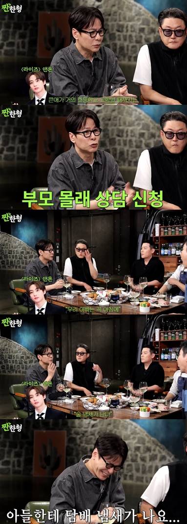 신동엽은 "형은 상담받으러 안 갔어? 아들이 술 냄새난다고 상담 신청했는데 어느 날 '아들한테 담배 냄새가 나요' 이러면 배신감 쩔겠는데"라고 말해 큰 웃음을 안겼다.