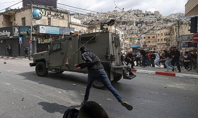 | 팔레스타인인들, 이스라엘 장갑차에 돌 투척 가자지구에 대한 지상전 추가 확대로 이스라엘군에 대한 팔레스타인인들의 반감이 더 확산하고 있는 가운데 4일(현지시간) 요르단강 서안 도시 나블루스에서 주민들이 이스라엘군의 장갑차에 돌을 던지고 있다. 나블루스=AFP연합뉴스 |