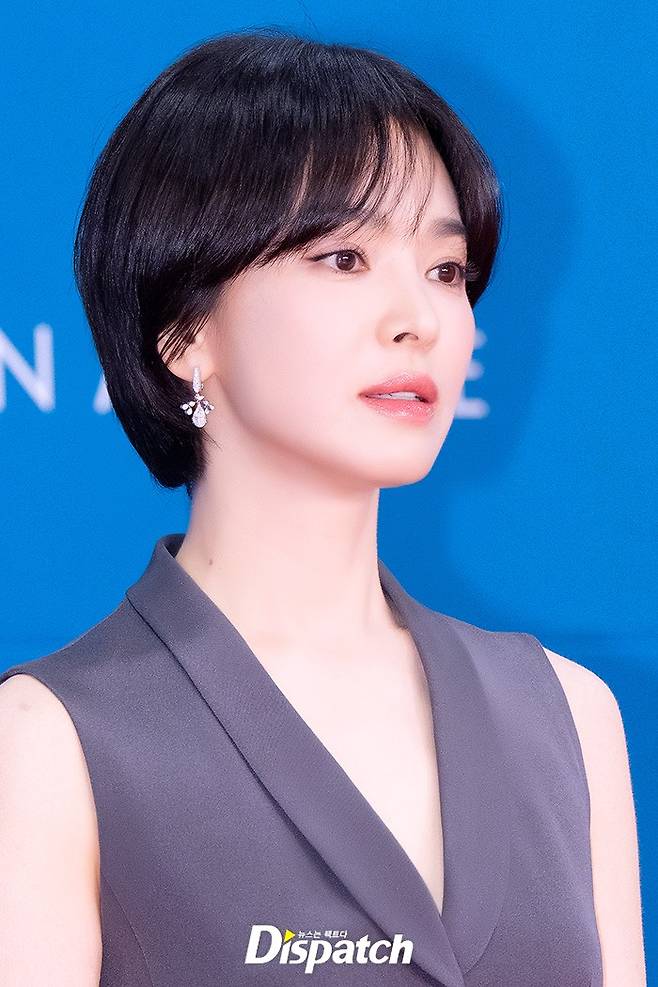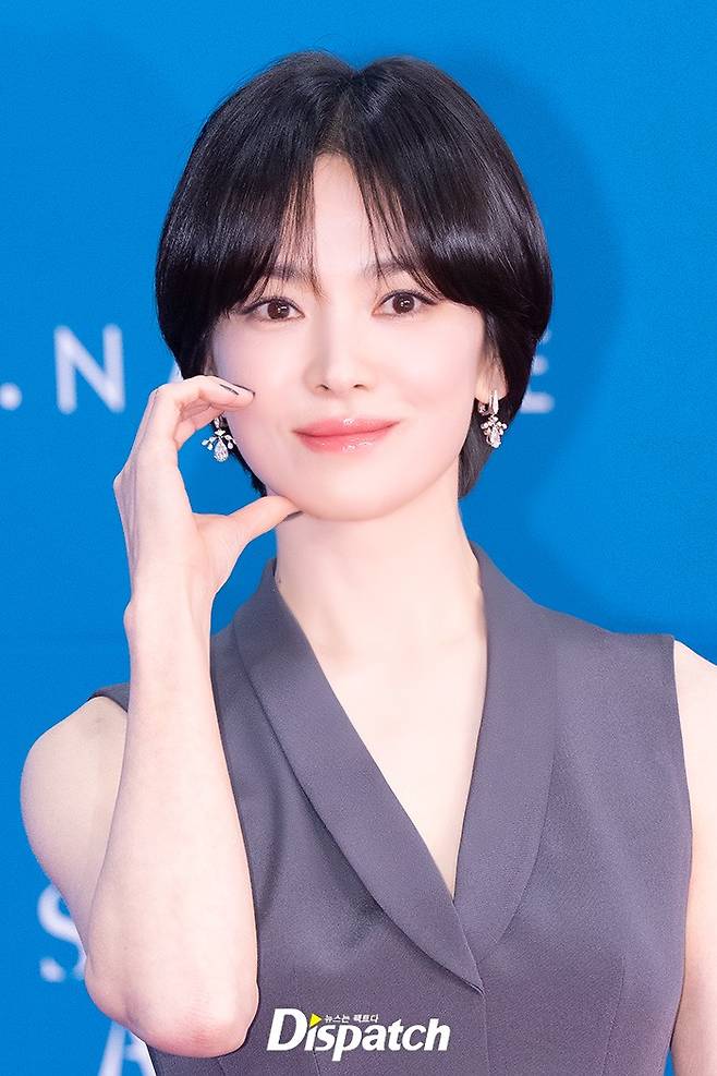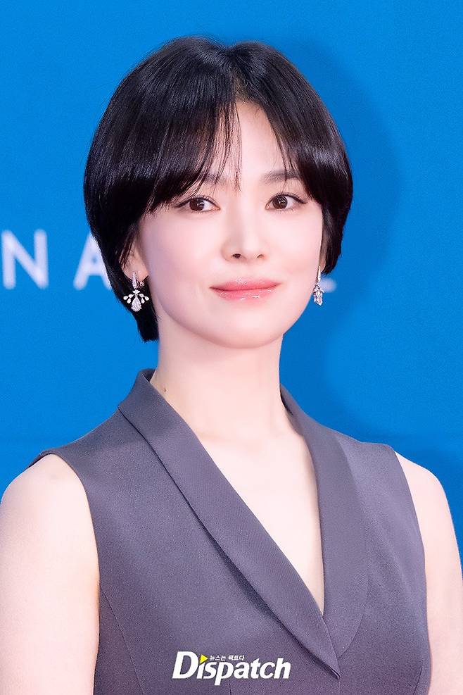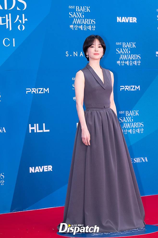 송혜교는 그레이 톤의 드레스로 우아한 미모를 뽐냈다. 청순한 분위기가 돋보였다.