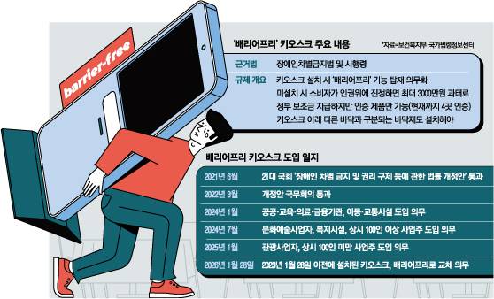 2023년 1월 처음 시행된 배리어프리 키오스크 설치법은 3년째 적용 대상을 늘리며 내년 1월 28일부터는 전면 의무화된다. 장애인 차별 금지 및 권리 구제 등에 관한 법률(장애인 차별금지법) 시행령 개정안에 따라 바닥 면적 50㎡ 이상 사업자가 키오스크를 설치할 때는 배리어프리 기능을 탑재한 기기를 반드시 설치해야 한다. 설치하지 않은 것 자체로 처벌받진 않지만, 불편함을 겪은 사람이 국가인권위원회에 진정을 하면 최대 3000만원의 과태료를 물 수 있다. 기존에 일반 키오스크를 이용하고 있던 사업자들도 기기를 교체해야 한다.