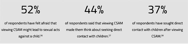 연구진이 CSAM 사용자 1만 1470명을 대상으로 설문조사를 실시한 결과, 65.3%가 아동 시절에 처음 접했다고 답했으며 그 중 절반은 "우연히 처음 보게 됐다"고 밝혔다. 다크웹에서 CSAM이 얼마나 무분별하게 노출되고 있는지를 보여준다. CSAM 사용자의 48.1%가 CSAM 사용을 중단하고 싶다고 응답했으며, 이들 중 일부는 도움을 요청하기 위해 토르 네트워크 내 '셀프 헬프' 사이트를 찾았다. 그러나 도움을 요청한 이용자의 73.9%가 실질적인 도움을 받지 못한 것으로 나타났다. CSAM 시청 시간과 빈도가 늘어날수록 우울감, 불안, 자해 충동, 죄책감, 수치심 등 부정적 정서가 함께 증가하는 경향을 보였다. 보고서는 "토르 네트워크의 익명성이 범죄의 온상이 되고 있으며, 구조적인 개입 없이는 CSAM 확산을 막기 어렵다"고 경고했다.[6]