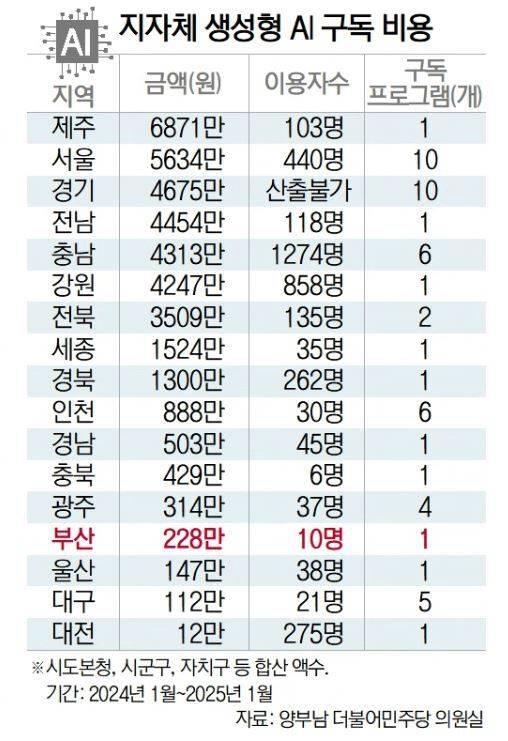 5일 더불어민주당 양부남 의원실에 따르면 최근 1년간(2024년 1월~2025년 1월) 부산시가 지출한 생성형 AI 구독료는 228만 원으로, 17개 광역지자체 중 14위였다. 가장 많은 비용을 AI 구독에 지출한 지자체는 제주도로 챗GPT 구독에 6871만 원을 사용한다. 2위는 서울시로 5634만 원을 들여 챗GPT를 포함해 10개의 AI 프로그램을 구독한다.